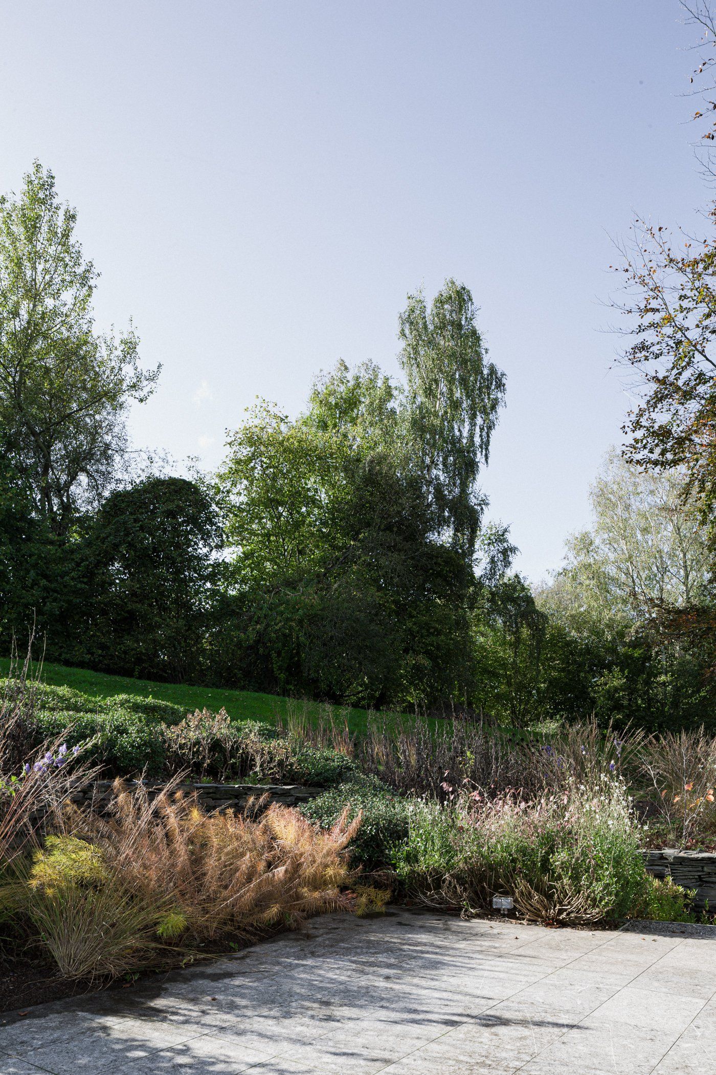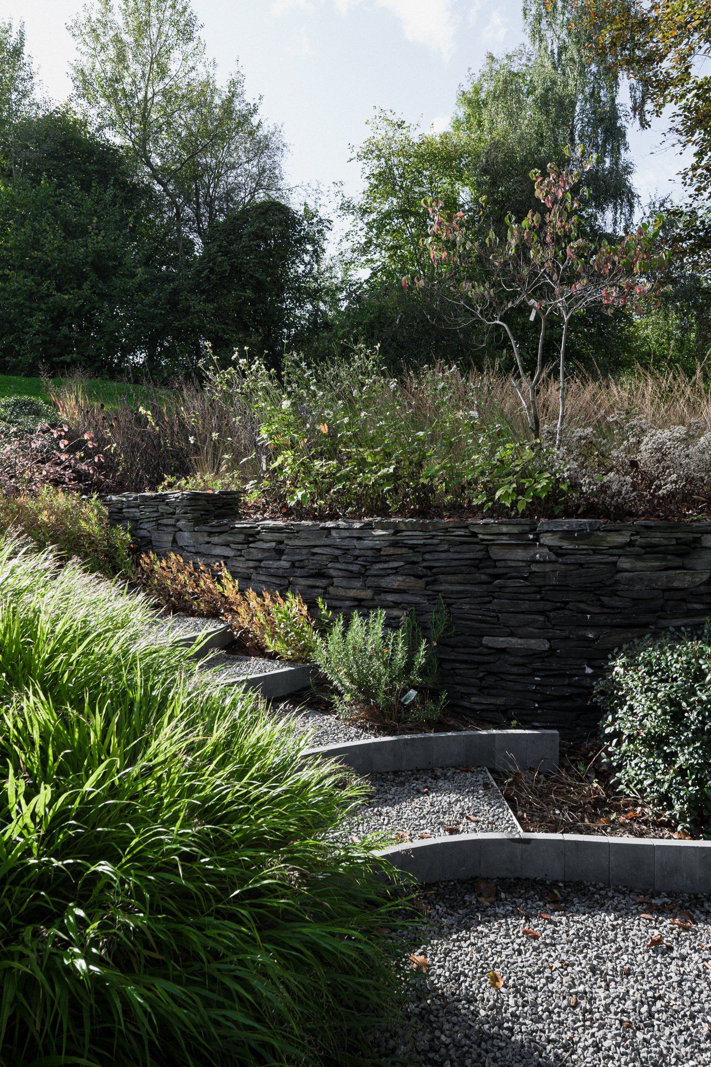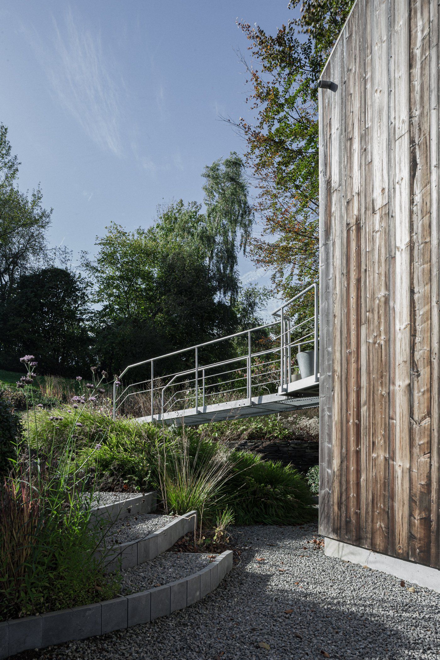 Een kleine tuin in een web van treden en terras in vlindervorm met metalen brug. 2015