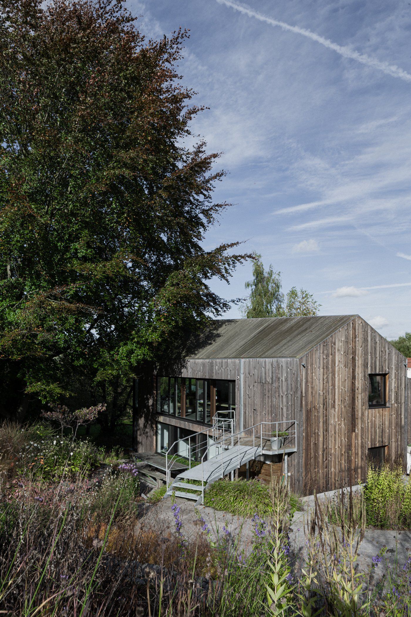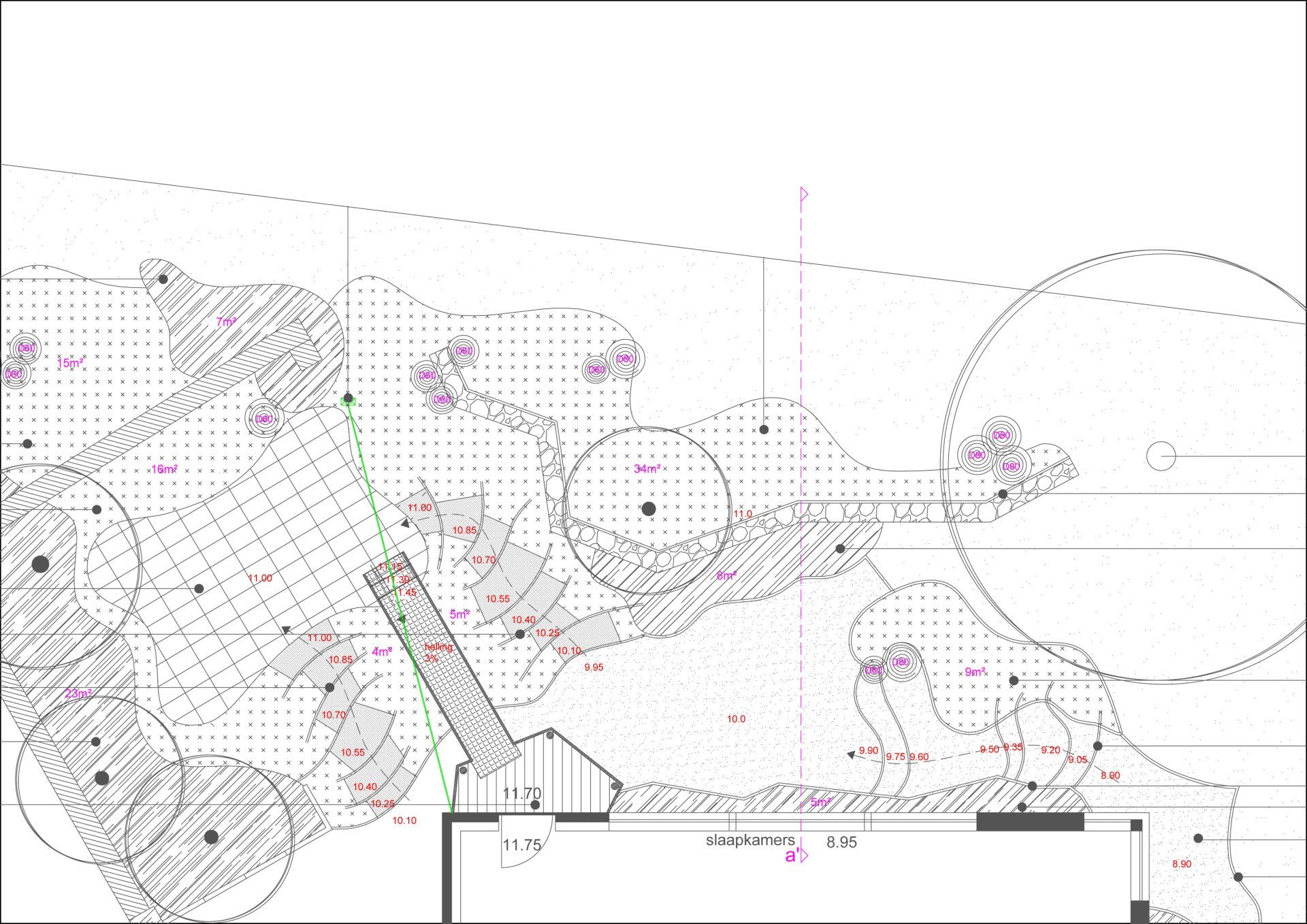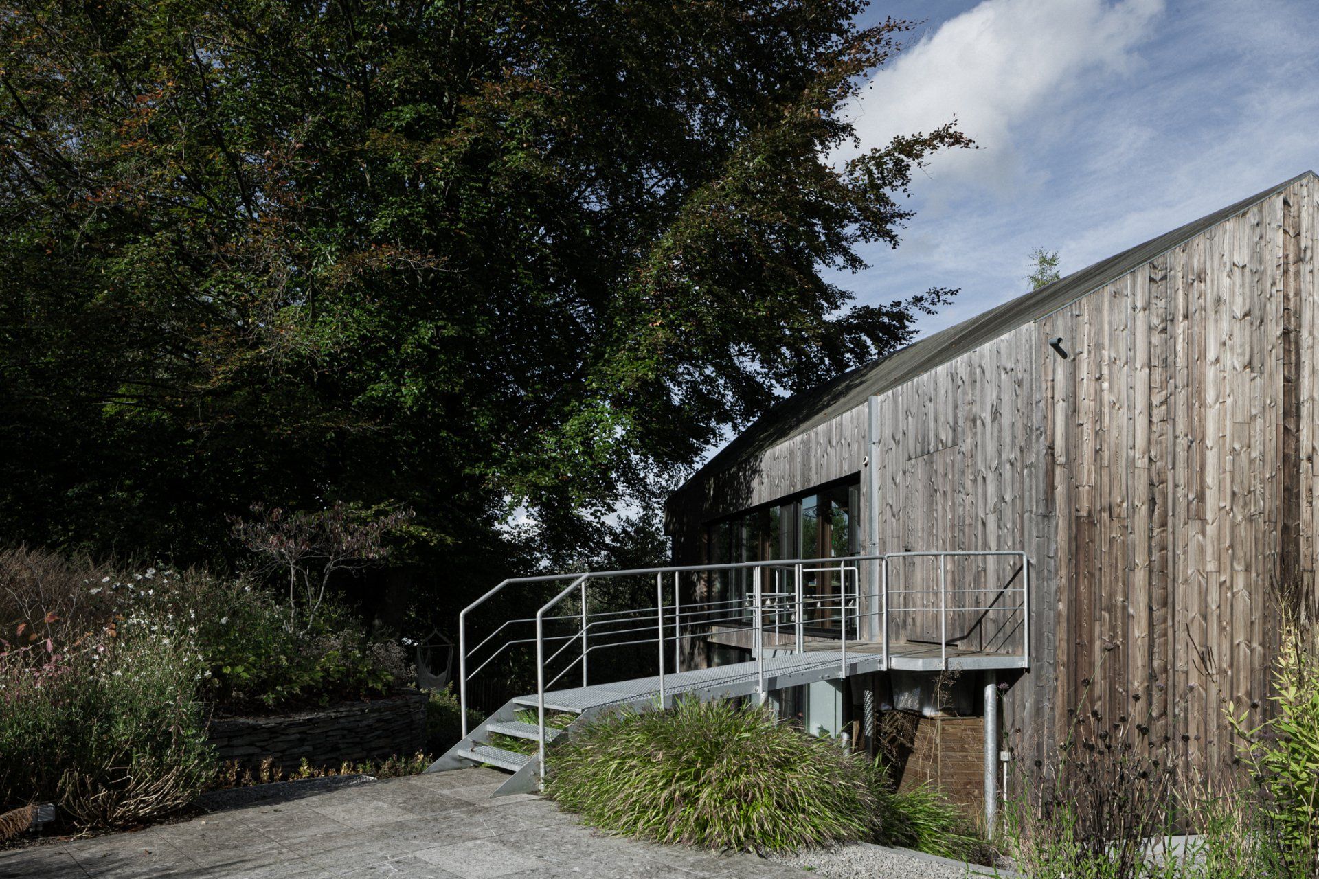 Een kleine tuin in een web van treden en terras in vlindervorm met metalen brug. 2015